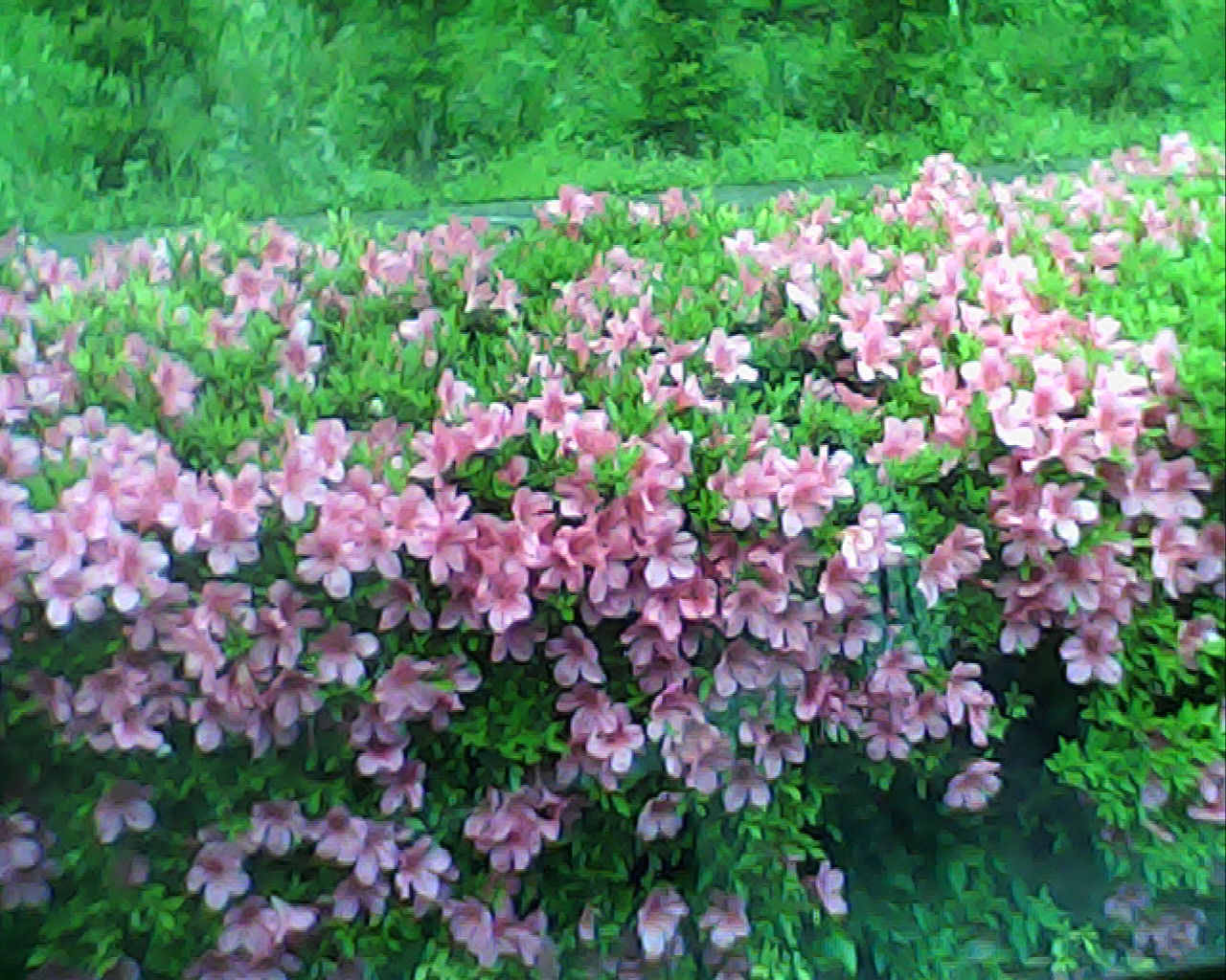 車で出かける途中、窓からツツジを眺める。